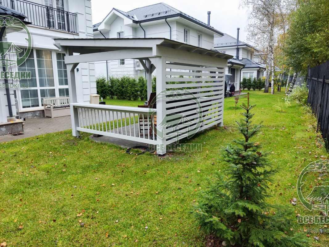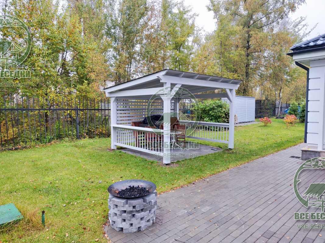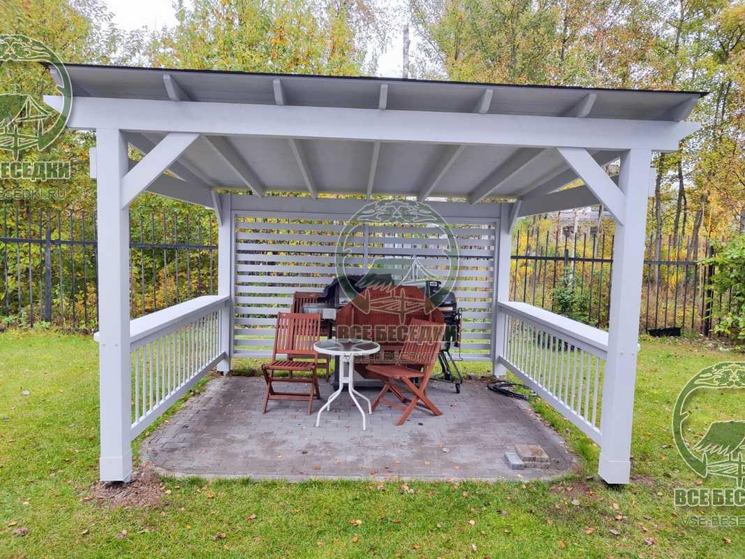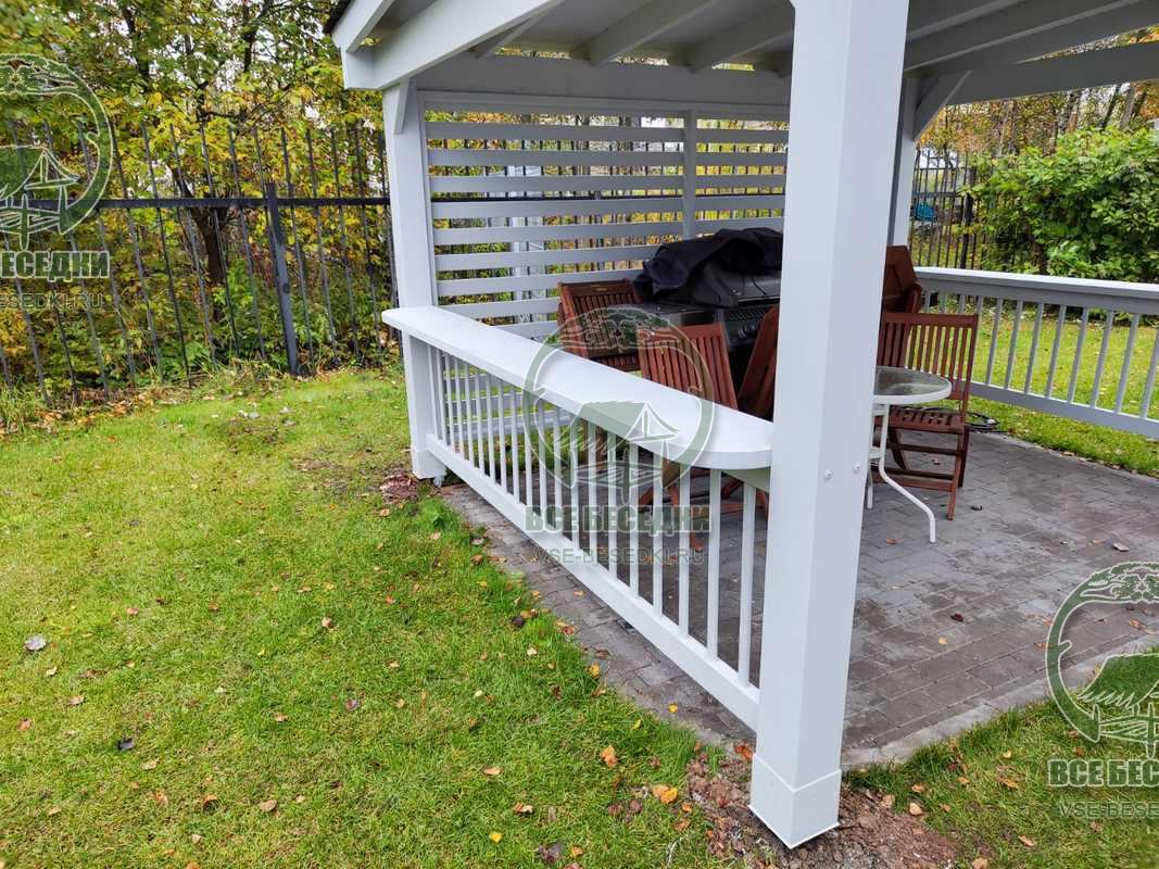 Белое покрытие придаёт беседке лёгкость и современный вид, а также защищает древесину от влаги и ультрафиолета. Размер 3,5×3 метра идеально подходит для размещения мангала, обеденной зоны или зоны отдыха с мебелью.